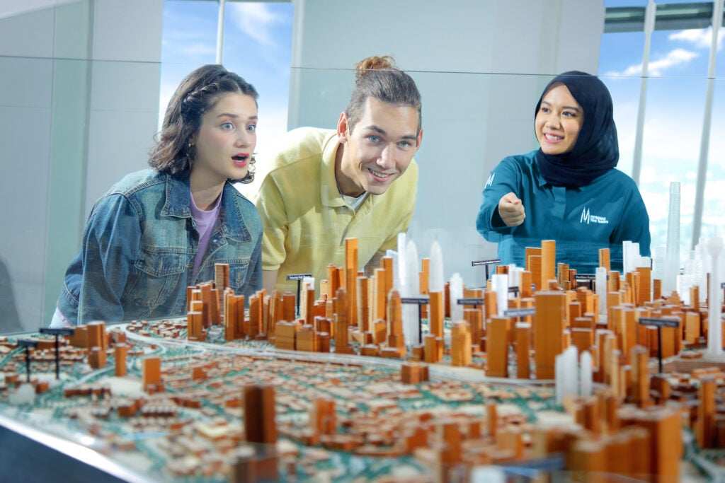 Superior bird’s-eye view from 370 meters above the ground, Postcard service, sight seeing telescope, scale models of KLCC Precinct development, interactive AR screens