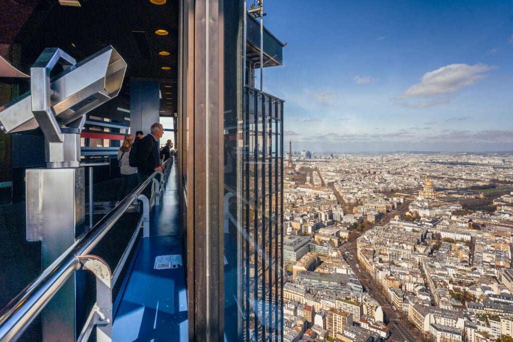 Located in the heart of the Montparnasse district, the observatory sits on the 56th floor, around 200 meters above the city. Visitors reach the top in just 38 seconds via one of Europe’s fastest elevators before stepping into a space surrounded by floor-to-ceiling windows.