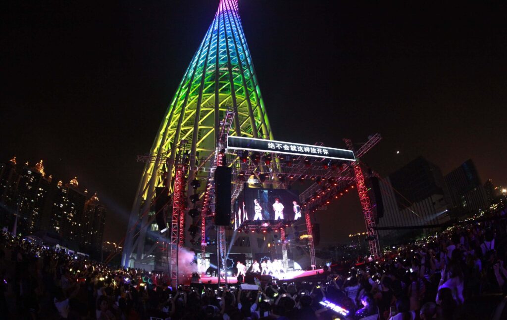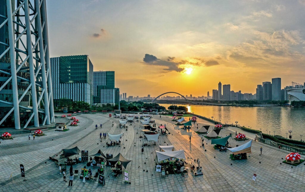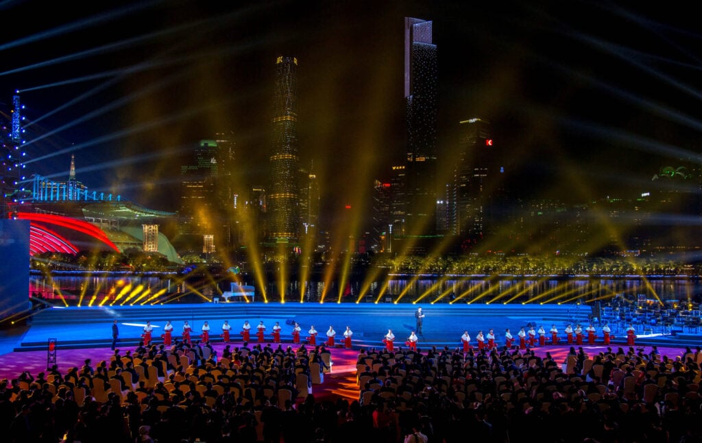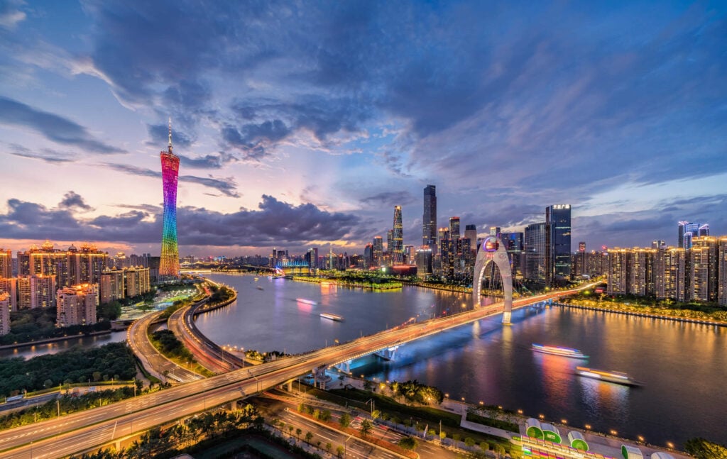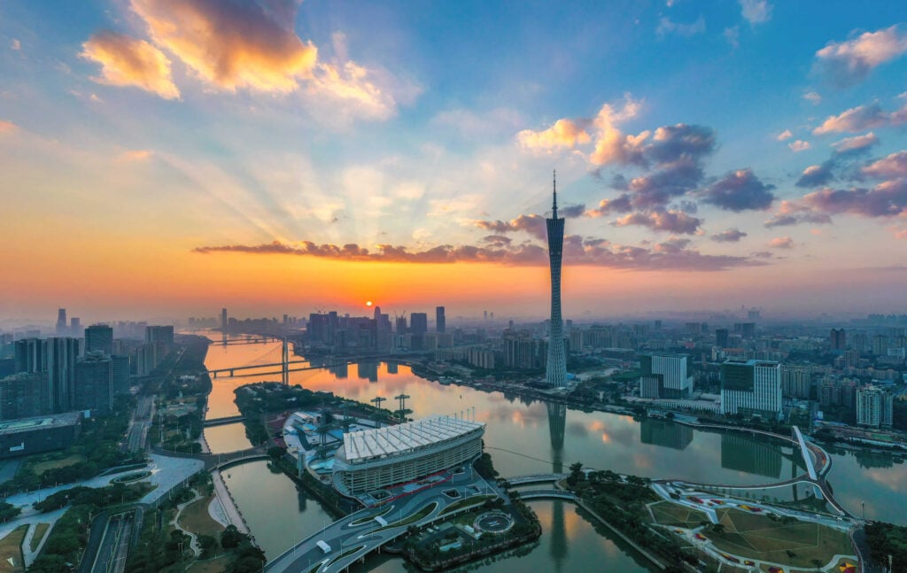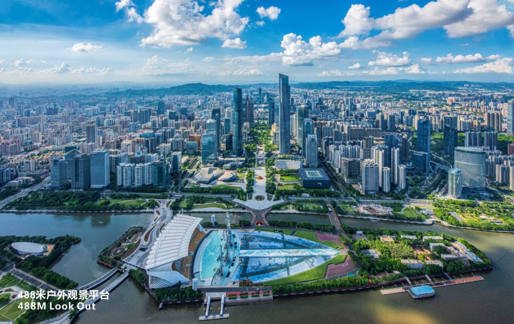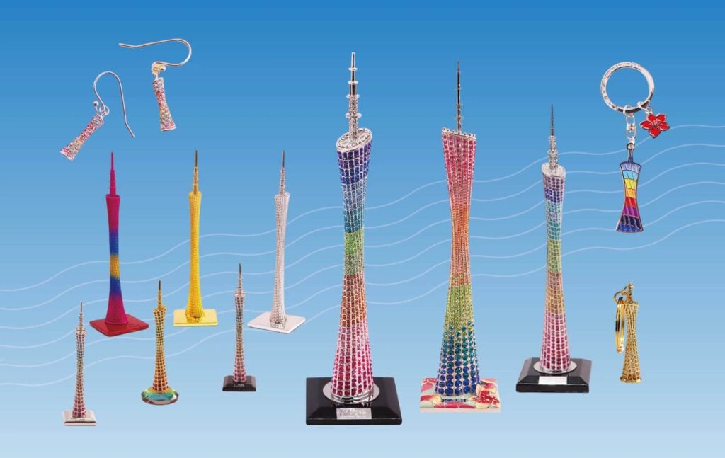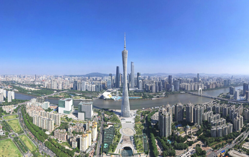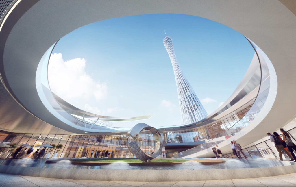 广州塔位于广州新中轴线与珠江景观带的交汇处,高 600 米,是壮观的城市地标。其惊人的高度、中间的转折、古怪的造型和格子设计使其成为广州最引人注目的高层建筑。广州塔于 2010 年开业,同年广州举办了首届亚运会,它已在广州的天际线上留下了自己的印记,吸引了超过 2000 万游客。.