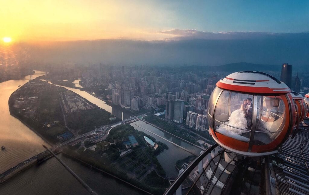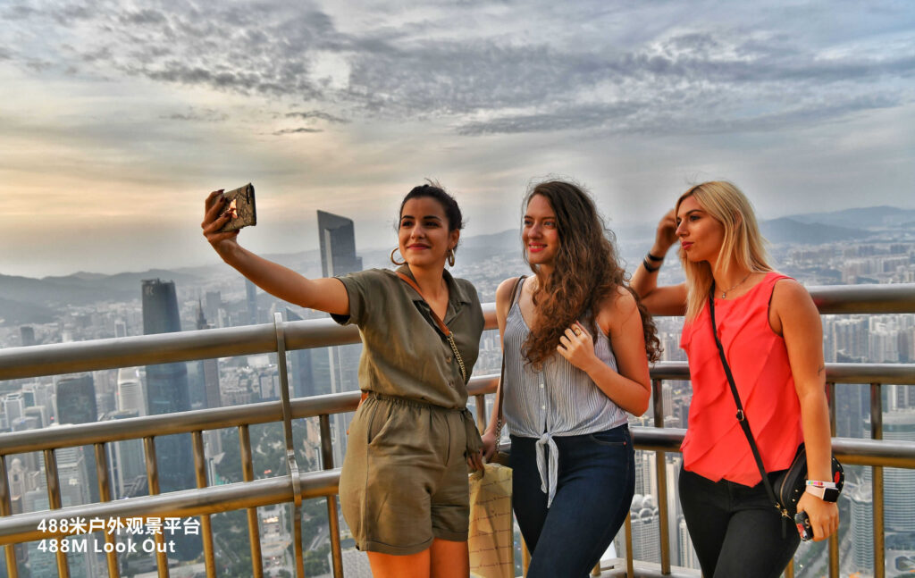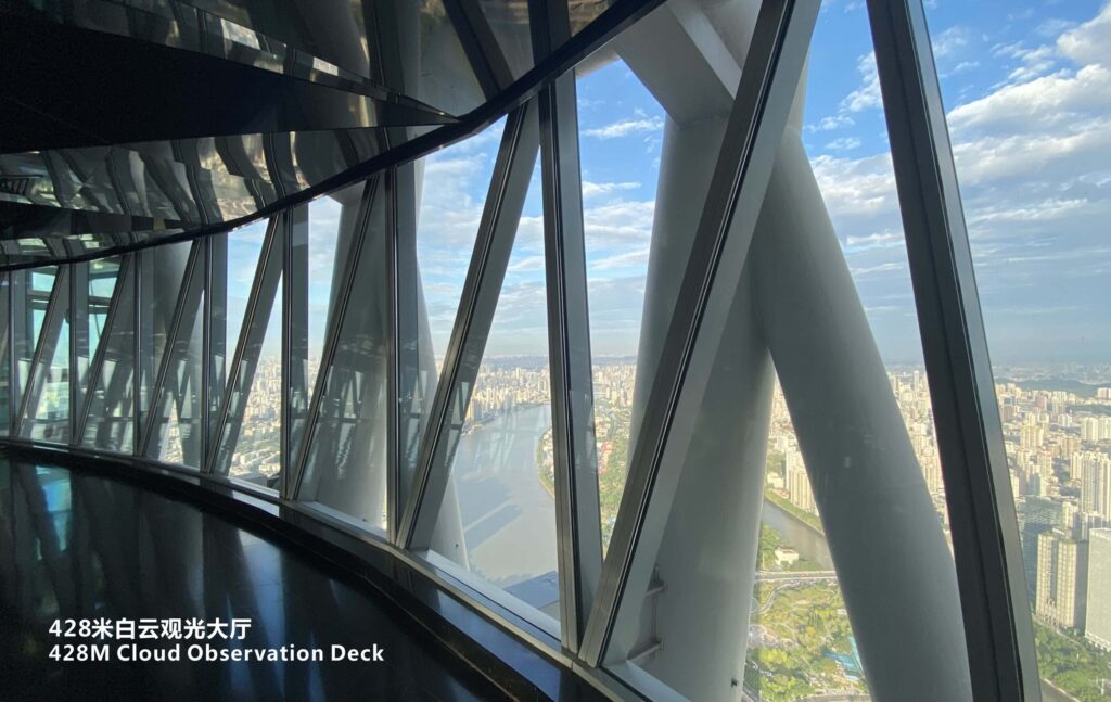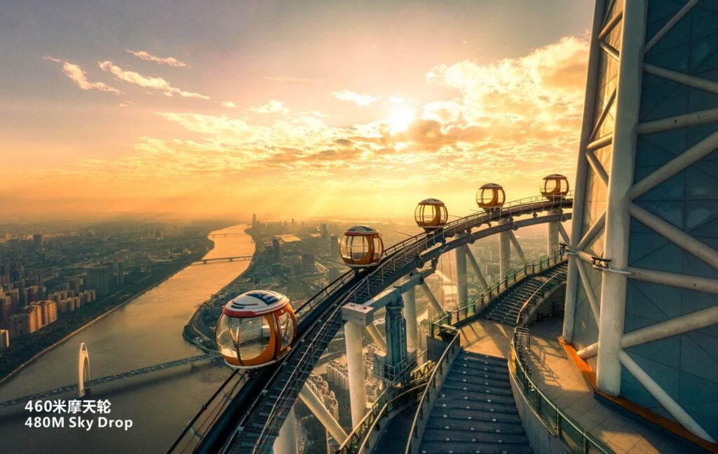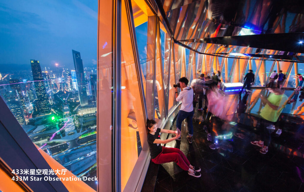 室内体验从 433 米高的云端和星空观景台开始,在这里您可以欣赏到珠江景观和新中轴线沿线城市建筑的壮观景色。由双层透明玻璃制成的玻璃栈道,让您在脚下俯瞰城市,感受强烈的刺激感。在 450 米高的户外观景台欣赏城市天际线。乘坐 460 米高的水平摩天轮(又称 “泡泡缆车”),翱翔云端,悠然自得。在吉尼斯世界纪录®"最高的颤栗之旅 "保持者--"高空坠落"(Sky Drop)上,您将体验到有史以来最高的令人心跳加速的垂直自由落体之旅。最后,您还可以登上 488 米高的瞭望台,俯瞰城市繁华的市中心和远处的景色。无论是与家人、朋友还是伴侣,您都可以在这里获得最难忘的体验。.