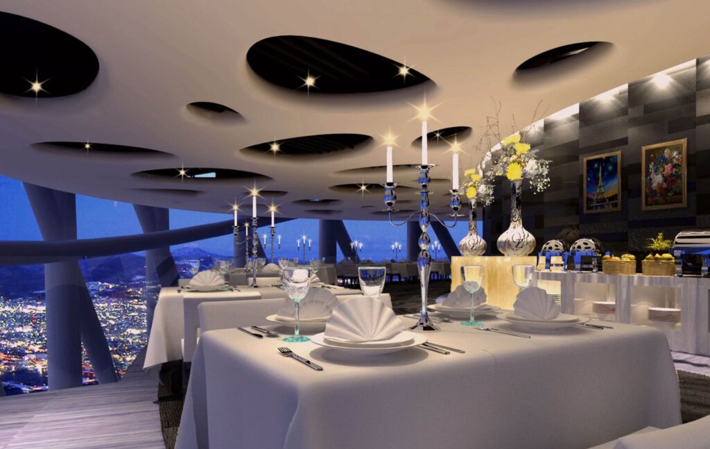 106F TWIST 地中海自助旋转餐厅 - 150;105F LUTECE 法式旋转餐厅 - 100;103F COLOUR CANTON - 120;B1 CHOPSTIX RESTAURANT - 280
