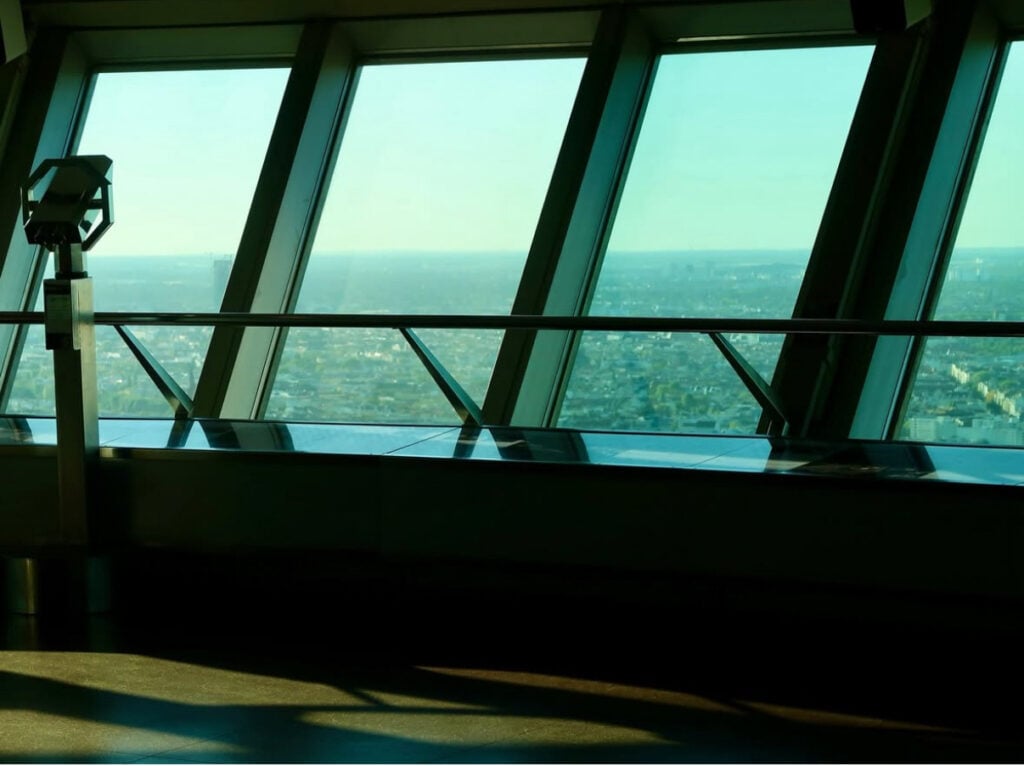 观景台位于城市上空 203 米处。通过两部高速电梯,游客只需 40 秒即可到达观景台。到达观景台后,游客可以欣赏到 360° 全景,在天气晴朗时,视野可达 70 公里,也可以在柏林最高的酒吧 “203 酒吧 ”小酌一杯。游客可以通过信息牌进一步了解相关景点及其在城市中的地理位置。柏林电视塔观光应用程序将带领用户沿着柏林墙进行一次穿越时空之旅,并对地平线上可见的最相关建筑进行讲解。.